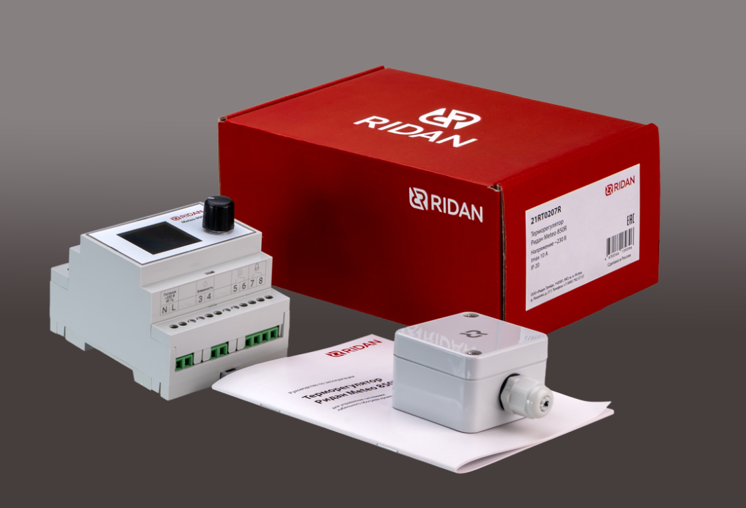 Терморегулятор произведён в России. Соответствует ПУЭ и ГОСТ, сертифицирован, гарантия 2 года. В комплекте идёт датчик температуры наружного воздуха (IP65, до 100 м), датчик кровли Ридан Roof 850R приобретается отдельно.